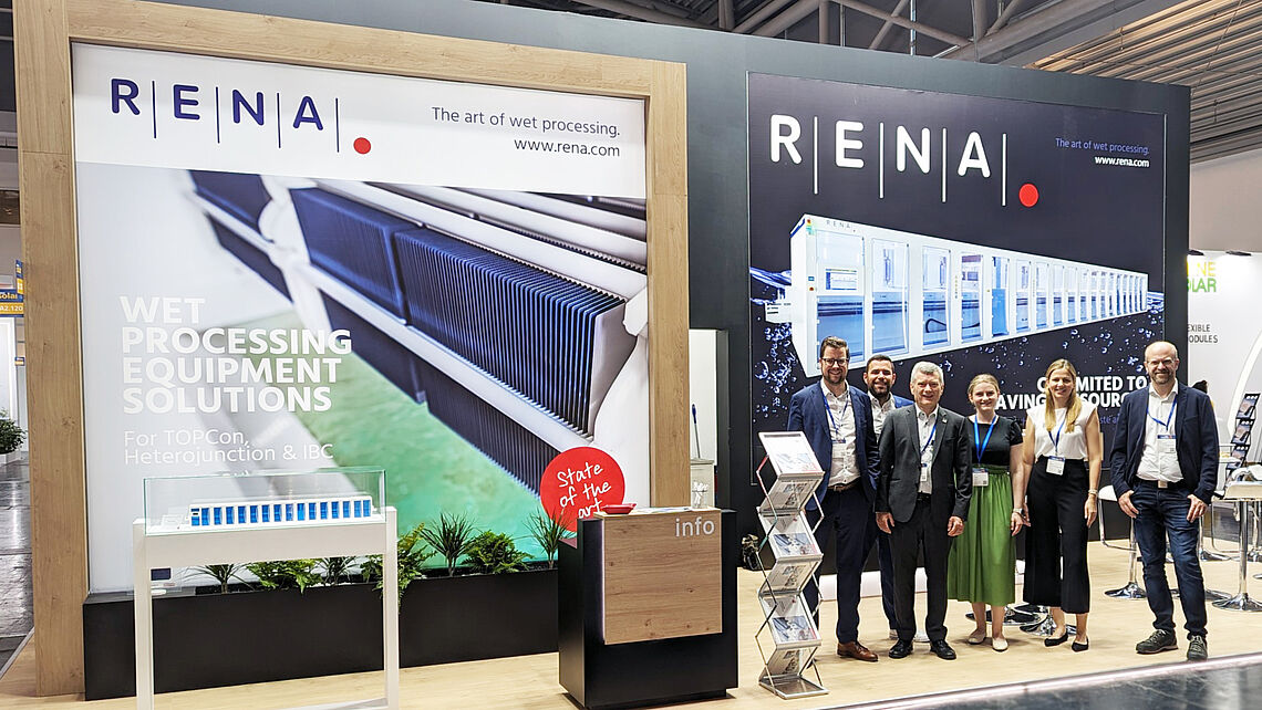 Integrated production systems for wet-chemical surface treatment were presented at the RENA Technologies GmbH stand in Hall A2. These include both automatic and manual wet processing systems used for the production of semiconductor products in various industries, including solar cells and solar voltaics. RENA offers automatic wet processing systems with carrier-less option as well as flexible input and output solutions for etching and cleaning of prime wafers.